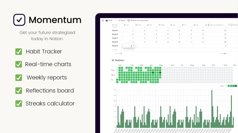 Momentum is a habit tracker that helps you to build good habits, break bad ones, reach your goals and keep motivated with streaks and charts. All on Notion.